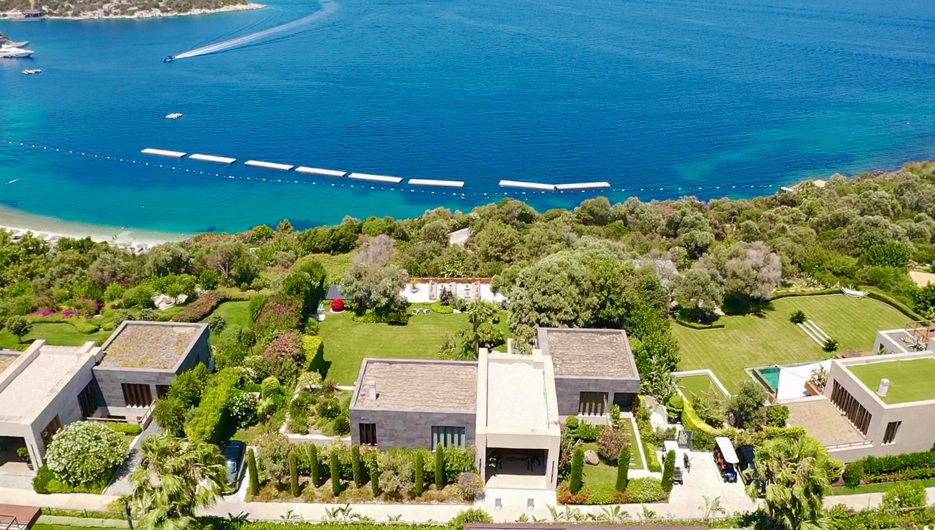 Beautifully set on a 600.000 m2 site at Paradise Bay which has two kilometers of coast line embracing three private bays, all offering breathtaking views of the Aegean Sea. Located on the 1st Row of the compound, the estate provides unobstructed views of the colorful nature of The Mediterranean, while allowing access to the main beach in under a minute.